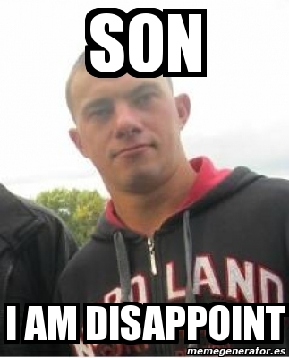 Son, I am disappoint is a meme that appears as a bold faced man who has a a greedy stare and an appearance with his eyes straight down like a unibrow and usually appears to have a frown as his head is in a shape of a vertical rectangle and a flat-top Thanks for the huffer that sent us the pics and idea